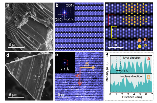 1. SiP2晶体(a-c)及其卸压样品(d-f)的形貌及原子分辨结构分析。常压截获的OSAL-SiP2展现出层间堆垛方向有序、层内原子排列无序的结构特征,并具有与晶体样品相似的层状形貌。