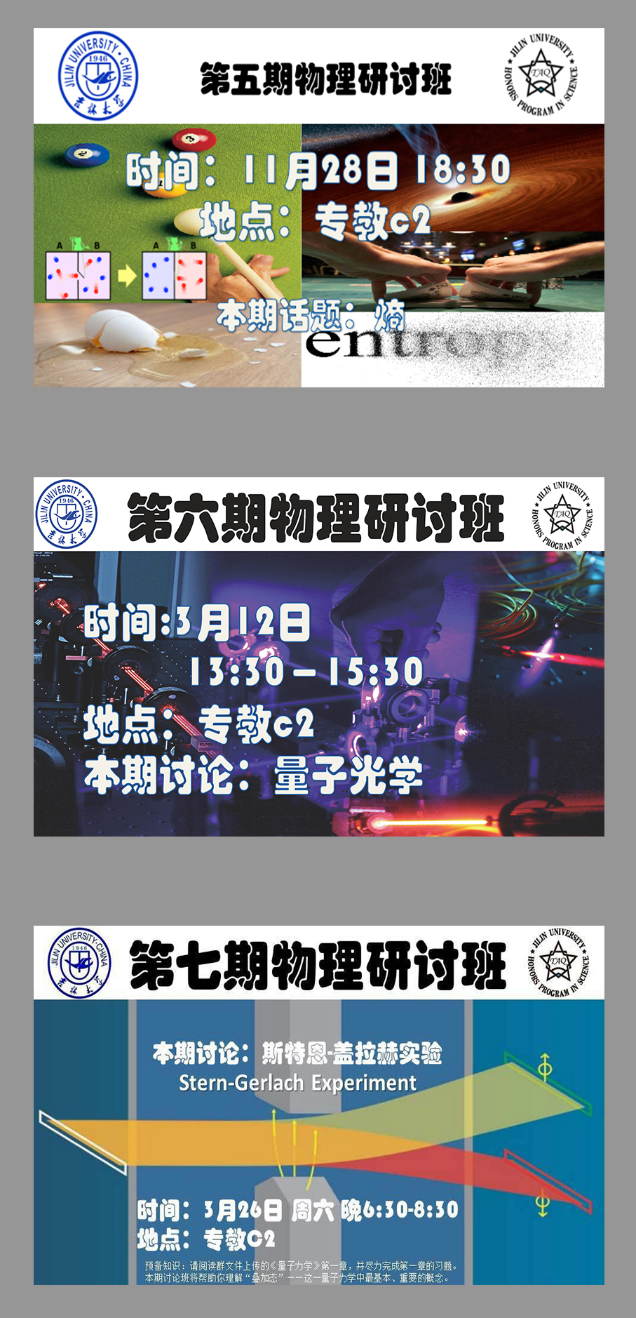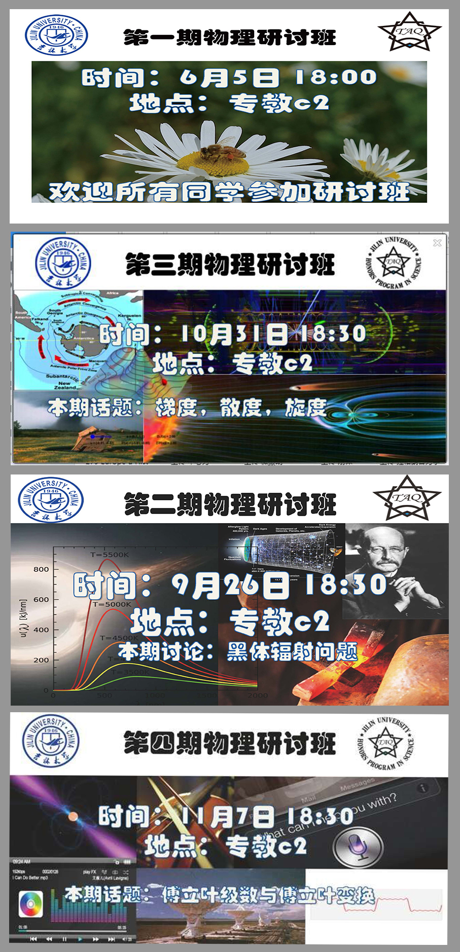 物理研讨班”目前已举办了七期,内容涉及“玻色爱因斯坦凝聚”,“黑体辐射”,“梯度,旋度,散度”,“傅立叶级数与傅立叶变换”,“熵”,“量子光学(光与原子相互作用)”,“斯特恩-盖拉赫实验”等等,每期活动时长约为2个小时,得到了约炮软件