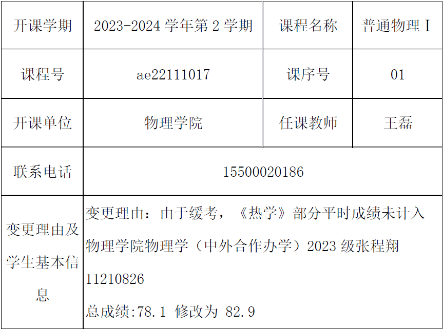 公示日期: 2024年_9月_11日至2024年_9月_18日如有异议请于公示期内向教务处教学运行科反映。 联系人: 邹老师 联系电话: 0431-85168962 相关材料详见附件: 1.吉林大学考核成绩复查、修改登记表 2.学院情况说明(学院教学委员会讨论通过、签字盖章) 3.试卷等相关佐证材料