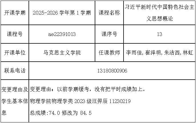 根据《关于进一步明确本科生课程考核等有关问题的通知》(校教字[2018]47号)文件有关精神,现对以下课程成绩更正进行公示: