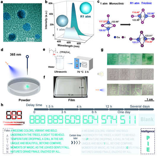 针对上述问题,肖冠军教授等人基于低维铜基卤化物多发光中心相互作用的刺激响应动态调控特性,引入具有大空间位阻的四丙铵阳离子(TPA+),首次在(TPA)CuI2纳米晶体系中,实现了低压强阈值触发、且具有显著光学对比度的压致不可逆荧光转变。在施加低至0.6 GPa的压强处理下,(TPA)CuI2纳米晶即可从原始的暗白光转变为明亮的蓝绿光。结构分析表明:0.6 GPa时发生了单斜相到三斜相的结构相变,导致[Cu2I4]2-二聚体对称性破缺,有效抑制了由簇中心电荷转移与偶极相互作用所引发的低能级自陷态形成,阻断了低能量的辐射复合通道。此外,相变后显著增强的氢键相互作用与TPA+的大空间位阻效应有效促进了高压亚稳相的保留。鉴于本研究中截获高压亚稳相的触发压强较低,可在日常生活中即可实现,团队进一步以聚乙烯醇为基底制备了基于 (TPA)CuI2纳米晶的荧光压强成像薄膜。该薄膜可直接应用于书写或盖印等静态行为的荧光信息显示,例如使用带有“吉林大学”样的印章施压时,其压痕处可呈现出显著且可区分的荧光颜色变化。此外,基于常压截获的亚稳相的恢复时间随施加压强阈值而动态变化的特性,开发了压强调控的动态信息防伪系统。例如,通过精确控制压痕的压强参数,可实现特定时间延迟后显示预设数字密钥的功能,抑或在设定时间窗口后,从鱼目混珠的“假情报”中提取真正的加密情报,偏离设定时间窗口后,真正的加密情报自动隐藏于泄露的“假情报”中。该研究为开发适用于压强成像、应力检测与信息加密的高性能压强响应材料提供了新思路。