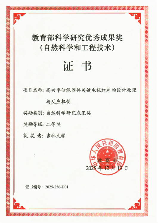 新型电池物理与技术教育部重点实验室杜菲教授作为第一完成人,联合魏芷宣教授、陈岗教授,材料科学与工程学院曾毅教授、化学学院乔振安教授共同完成的“高功率储能器件关键电极材料的设计原理与反应机制”项目,荣获自然科学研究成果奖二等奖。