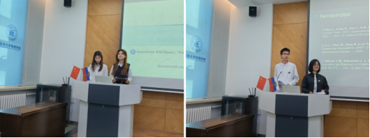 2023级学生聚焦前沿物理理论、航天工程、新材料、氢能利用等领域展开汇报。李飞翔以“Квантование трехмерных суперсимметричных калибровочных теорий с расширенной суперсимметрией”为题,探究扩展超对称性下三维超对称规范理论量子化的数学研究方法;曾圣皓以“Космический лифт: технология космических перевозок будущего”为题,解析太空电梯工作原理、材料瓶颈与未来航天应用前景;刘苏瑾以“Влияние водорода и ионизирующего излучения на структуру и свойства современных материалов”为题,剖析氢和电离辐射对现代材料结构性能的作用机理,并分享抗损伤材料设计思路;张睿元以“Плазменные двигатели для космических миссий будущего”为题,阐述等离子体发动机在未来航天任务中的推进优势与应用价值;张忻宁以“Системы хранения и очистки водорода на основе металл-органических каркасов и гидридообразующих металлов”为题,围绕金属有机框架材料储氢、氢能净化前沿技术,结合国内实际案例展开论述;崔珈瑀以“Особенности формирования водородной подсистемы в решетках палладия и никеля”为题,分析钯、镍金属内部氢子系统形成规律及其在生成生活中的应用场景。