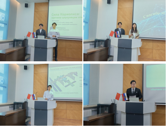 2024级学生选题兼顾自然现象、新材料、民生应用与天体物理,视角丰富多元。徐瑜泽、尤星博以“Сила Кориолиса: причина циркуляции атмосферы и океана”为题,解读科里奥利力对大气、海洋环流的影响,纠正大众常见认知误区;孙静萱、万斯同以“Беспроводная передача энергии: от проводов к энергии будущего”为题,介绍了无线电能传输技术原理、应用现状及未来发展前景;张北辰以“Физические механизмы теплоотвода в мобильных телефонах”为题,探究手机发热根源与散热物理机制,搭建预测温度变化简化物理模型;白其灼以“«Кровавое солнце» как физическое явление”为题,科普血色太阳大气光学成因,呼吁重视大气环境保护;喻子阅、程益优以“Пьезоэлектрические интеллектуальные композитные материалы”为题,梳理压电智能复合材料发展历程与当下科研攻关方向;李月、乔远辉以“Физика разрушения и созидания: влияние массивных звёзд на формирование новых”为题,依托詹姆斯·韦伯望远镜观测数据,阐释大质量恒星演化与新星形成之间的物理关联。